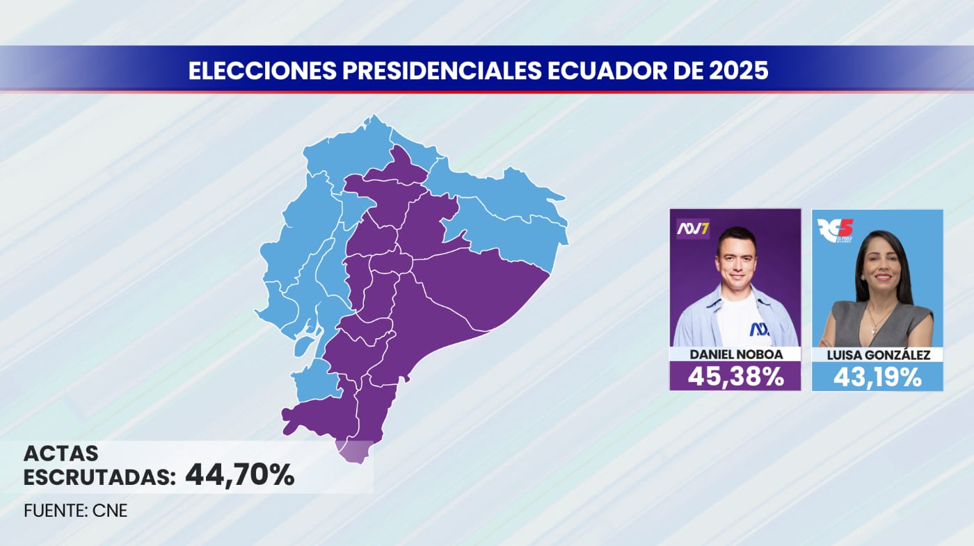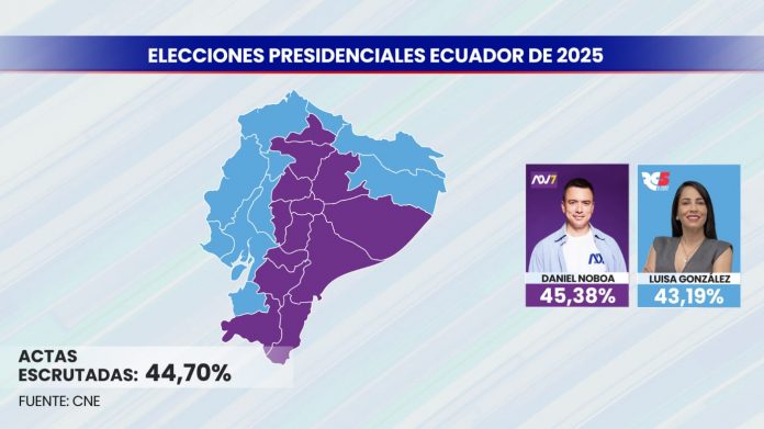 Con el 35% de las actas escrutadas, los resultados preliminares indican que el presidente y candidato a la reelección, Daniel Noboa, lidera con el 45,5% de los votos, seguido de cerca por la candidata de la izquierda, Luisa González, quien obtiene el 43%. Este escenario sugiere una probable segunda vuelta electoral en abril, ya que ninguno de los candidatos alcanzaría la mayoría requerida para una victoria en primera ronda.